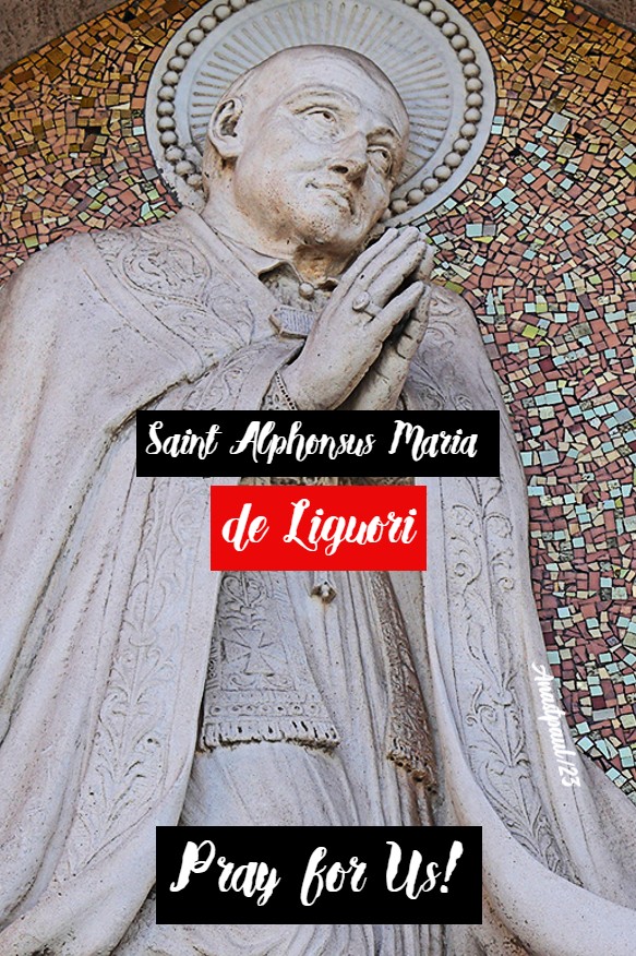 PRAYER – O God, Who through blessed Alphonsus Maria, Thy Confessor and Bishop, fired with love for souls, enriched Thy Church with a new family; we beseech Thee that, taught by his saving counsels and strengthened by his example, we may be enabled, happily to come to Thee. Through the same Jesus Christ, Thy Son our Lord, Who lives and reigns with Thee, in the unity of the Holy Ghost, God, world without end. Amen (Collect).