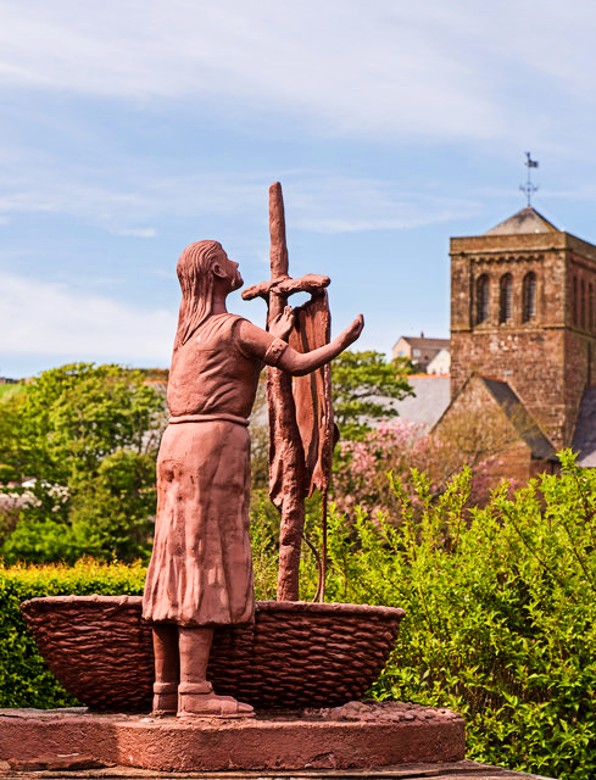 According to her Vita, an Angel presented Bega with an arm ring (bracelet) inscribed with the Cross as a token of her sacred promise. Bega escaped by the grace of God and with miraculous assistance. In onr account, Bega was transported across the Irish Sea by a clod of soil. She arrived safely on the English coast at Cumbria. Settling there, Bega lived in strict seclusion in a hut she built, in amongst a grove of trees near the seashore. She survived on food brought to her by seagulls and gannets.