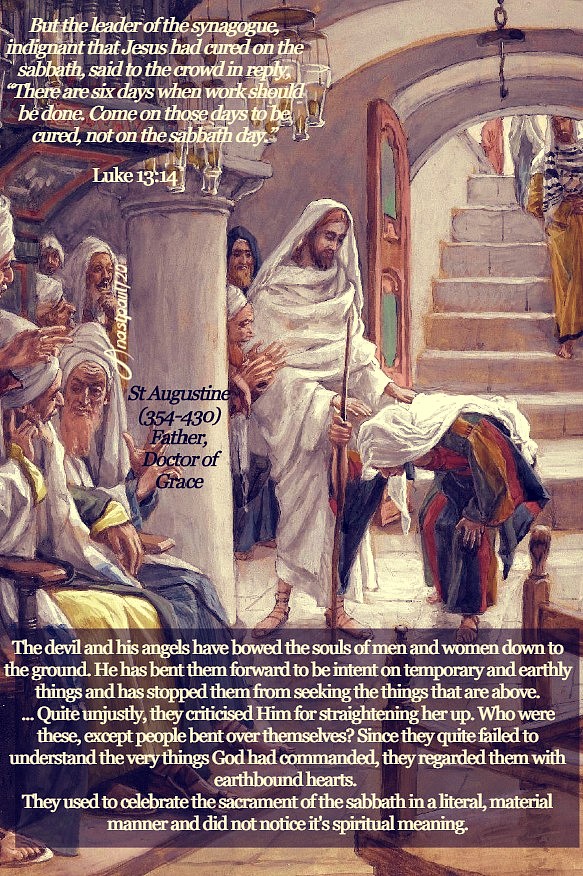 Since that is what the Lord says about the woman whom Satan had bound for eighteen years, it was now time for her to be released from her bondage on the sabbath day. Quite unjustly, they criticised Him for straightening her up. Who were these, except people bent over themselves? Since they quite failed to understand the very things God had commanded, they regarded them with earthbound hearts. They used to celebrate the sacrament of the sabbath in a literal, material manner and did not notice it’s spiritual meaning!” – St Augustine (354-430) Father, Doctor of Grace (Sermon 162)