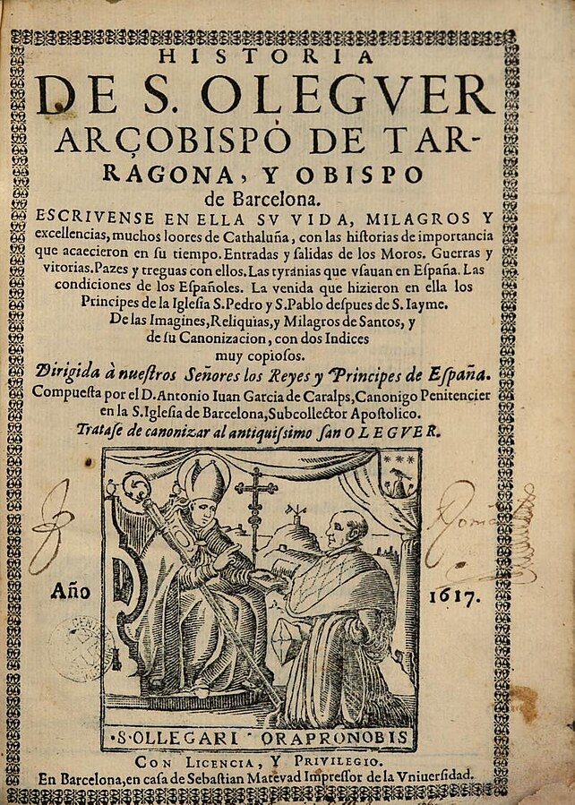 The Roman Martyrology reads: “At Barcelona in Spain, the blessed St Ollegarius, who was first a Canon and afterwards the Bishop of Barcelona and Archbishop of Tarragona.”