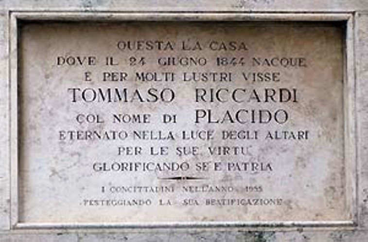 THIS IS THE HOUSE WHERE HE WAS BORN, ON 24 JUNE 1844 AND HE LIVED, FOR MANY YEARS, TOMMASO RICCARDI. WITH THE NAME OF PLACIDO ETERNATED IN THE LIGHT OF THE ALTARS FOR HIS VIRTUES – GLORIFYING SELF AND HOMELAND