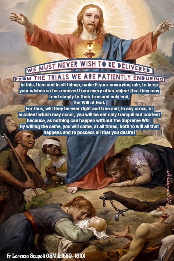 For thus, will they be ever right and true and, in any cross, or accident which may occur, you will be not only tranquil but content because, as nothing can happen without the Supreme Will, by willing the same, you will come, at all times, both to will all that happens and to possess all that you desire!
