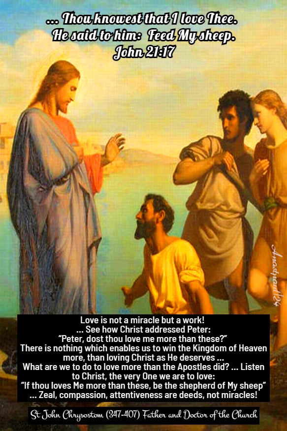 Love is not a miracle but a work! Love is the fulfillment of the Law” (Rm 13:10) … Therefore, have love among thyselves and thou wilt be counted among the Apostles, even amongst the first of them. Do thou want another proof of this teaching? See how Christ addressed Peter: “Peter, dost thou love me more than these?” There is nothing which enables us to win the Kingdom of Heaven more, than loving Christ as He deserves … What are we to do to love more than the Apostles did? … Listen to Christ, the very One we are to love: “If thou loves Me more than these, be the shepherd of My sheep”… Zeal, compassion, attentiveness are deeds, not miracles!” – St John Chrysostom (347-407) Bishop of Constantinople, Father and Doctor of the Church (2nd Sermon on the inscription to the Book of the Acts of the Apostles).