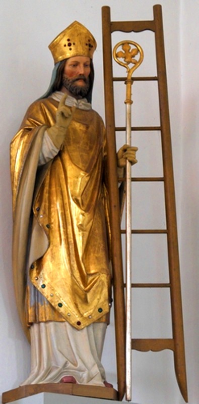 When leaving for Rome, Emmeramus was unjustly accused of having kidnapped Uta, the Duke’s daughter. To avenge this dishonour, Lambert, the girl’s brother, pursued Emmeramus with an armed troop and caught up with him at Klein-helfendorf, near Aibling (Diocese of Freising). Wishing to protect the real culprit, Emmeramus did not defend himself and received numerous wounds. The Clerics who accompanied him carried him to Ascheim where death put an end to his cruel sufferings. His tortures had involved a ladder, different tortures being applied for each rung thereon. At his death, a heavenly ladder was seen being extended to the Martyr for his final climb to his his great Lord.