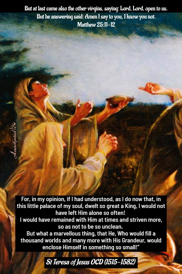 ‘The progress of a soul,‘ says St Teresa, ‘ does not consist in thinking much of God but in loving Him and this love is gained by resolving to do much for Him.‘