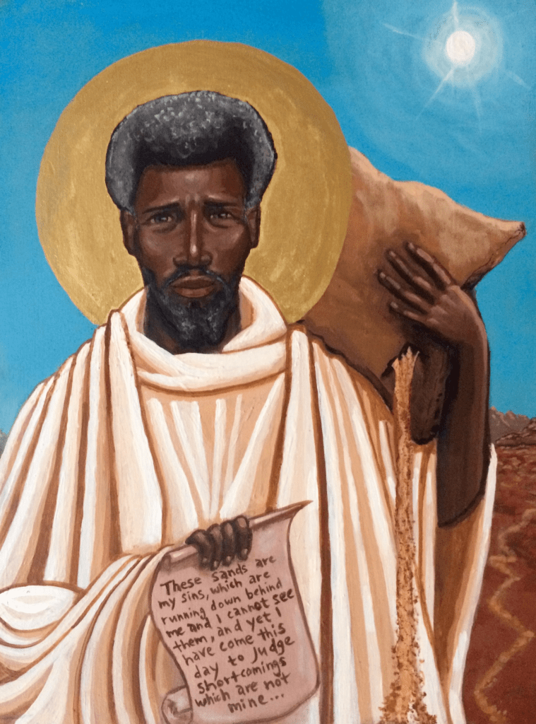 The Roman Martyrology reads: “St Moses, an Ethiopian, who gave up a life of robbery and became a renowned anchorite. He converted many robbers and led them to a Monastery.”