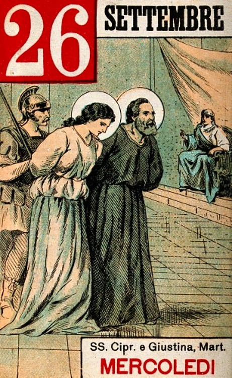 St Cyprian (Died 2nd Century) Bishop Martyr of Antioch AND St Justina of Antioch (Died 2nd Century) Virgin Martyr The Roman Martyrology reads today: “At Nicomedia, the birthday of the holy Martyrs Cyprian and Justina, Virgin. Under the Emperor Diocletian and the Governor Eutholmius, Justina suffered much for the Faith of Christ and coverted Cyprian, who while a magician, endeavoured to bring her under the influence of his magical practices. She afterwards suffered Martyrdom with him. Their bodies being exposed to the beasts, were taken away in the night by some Christian sailors and carried to Rome. They were subsequently taken into the Constantian Basilica and deposited near the Baptistry.” Their Martyrdom: https://anastpaul.com/2024/09/26/saints-of-the-day-26-september-st-cyprian-of-antioch-bishop-martyr-and-st-justina-virgin-martyr-died-2nd-century/