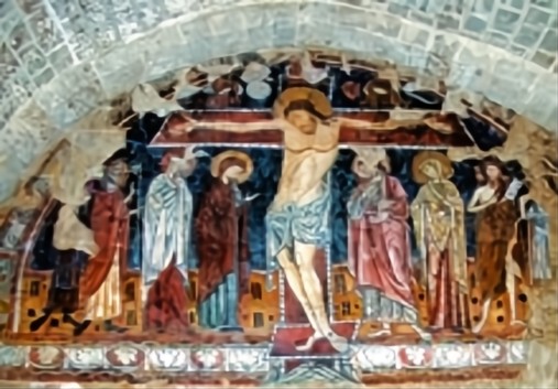 Crucifixion with the Virgin and SS Severus (damaged), Augustine, Mary Magdalene, John the Evangelist, Elizabeth, John the Baptist and Martirius (lost) Fresco (13th Century) in SS Severus and Martirius.