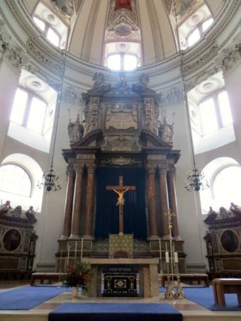 High Altar, Salzburg Cathedral (Salzburger Dom) Salzburg, Austria. Saint Rupert is depicted atop the altar carrying a barrel of salt in his left hand and a bishop’s crozier in his right. Saint Virgil is also represented atop the altar, opposite Saint Rupert.