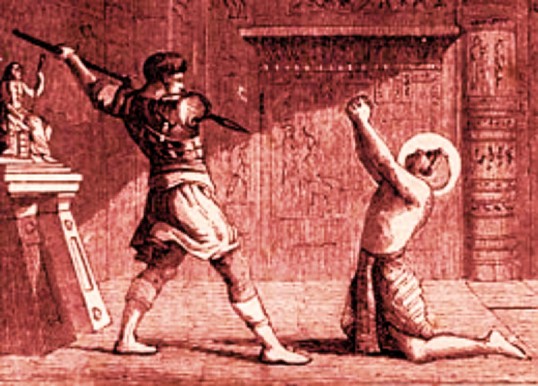 Giving way to passion and superstition, the Commanding Officer at length worked himself up to such a degree of frenzy as to run a stake into the entrails of the meek servant of Christ, who by his patient constancy attained to the glory of Martyrdom.