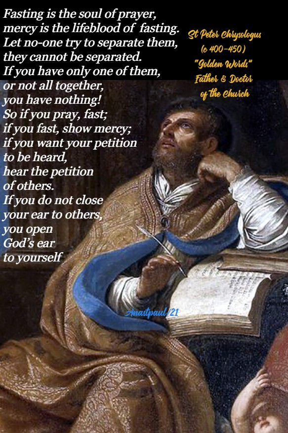“There are three things, my brethren, by which faith stands firm, devotion remains constant and virtue endures. They are prayer, fasting and mercy. Prayer knocks at the door, fasting obtains, mercy receives. Prayer, mercy and fasting: these three are one and they give life to each other.