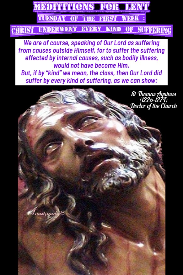 But, if by “kind” we mean, the class, then Our Lord did suffer by every kind of suffering, as we can show in three ways: