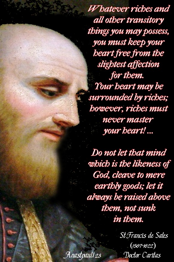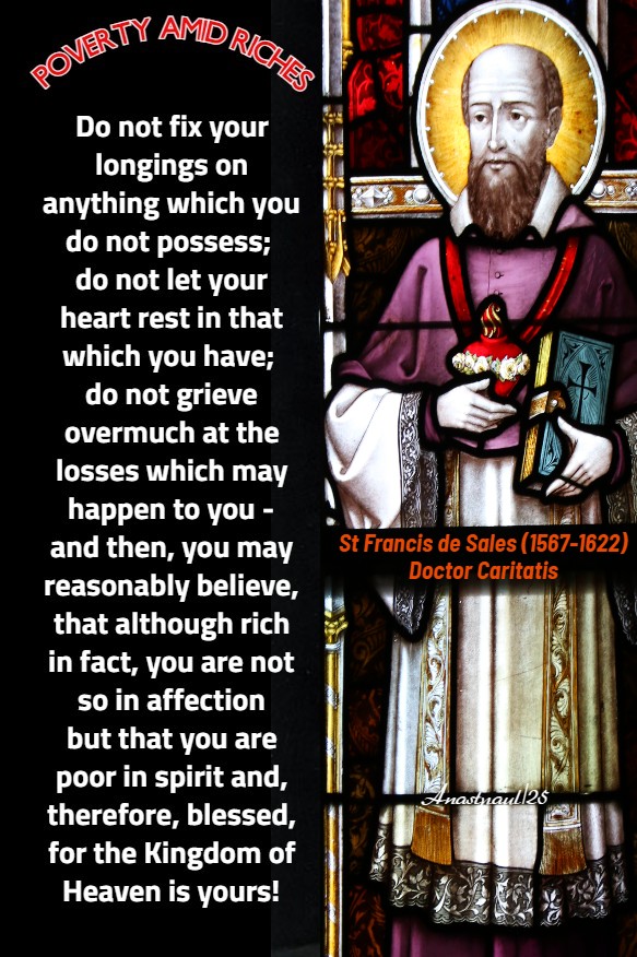REFLECTION – “The possessions which we have, are not our own: God has given them to us to cultivate and He wishes us to render them fruitful and profitable … Always deprive yourself, therefore, of some part of your means, giving them to the poor with a willing heart … It is true that God will return it to you, not only in the next world but also in this, for there is nothing which makes a person prosper, in temporal matters, so much, as almsgiving. But until such time as God shall repay it, you will always be impoverished to that extent. Oh! how holy and rich is the impoverishment which is caused by almsgiving.