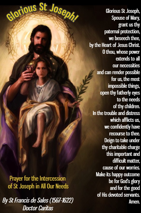 Remember us, Saint Joseph and plead for us to your Foster-Child. Ask your most holy bride, the Virgin Mary, to look kindly upon us, since she is the Mother of Him, Who, with the Father and the Holy Ghost, lives and reigns eternally. Amen.” – St Bernardine of Siena (1380-1444) (An excerpt on his Sermon 2 of St Joseph).