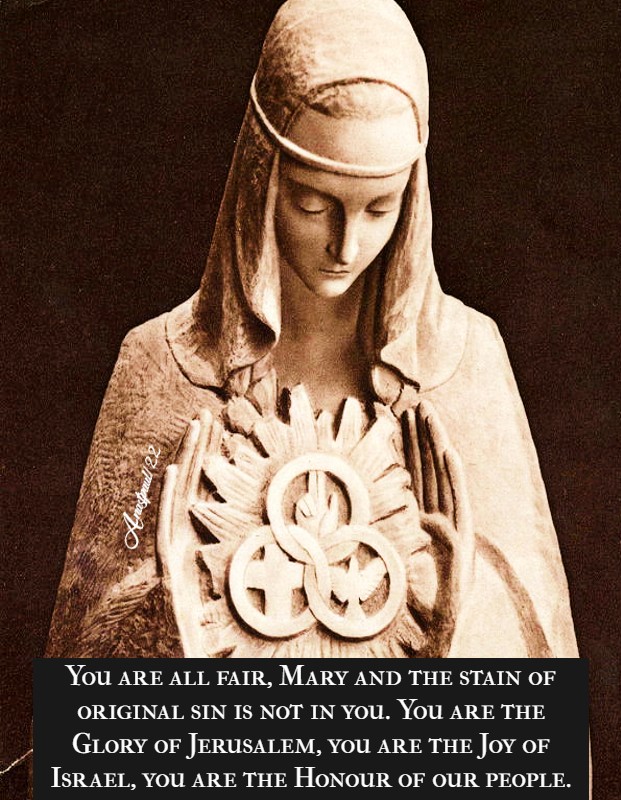 You are the holiest of women, the Virgin-Mother thrice holy because you are holy of the Father, holy of the Son, holy of the Holy Spirit of Love. Hence, with Holy Church I repeat, “You are all fair, Mary and the stain of original sin is not in you. You are the Glory of Jerusalem, you are the Joy of Israel, you are the Honour of our people.”