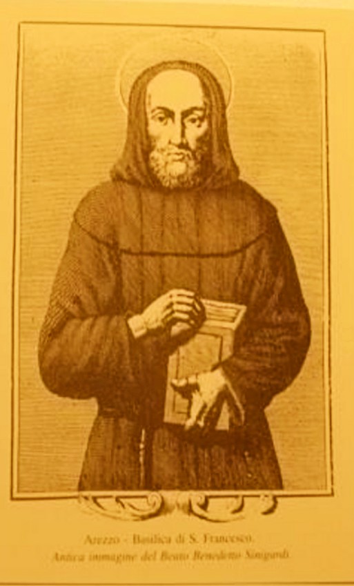 The call of the Lord to Benedetto Sinigardi occurred during a sermon which St Francis of Assisi gave in 1211 in Arezzo. The poor man’s fame attracted huge crowds everywhere and that day Piazza Grande was packed to capacity. Among the listeners there was also the twenty-year-old Benedetto, son of Tommaso Sinigardo de’ Sinigardi and Countess Elisabetta Tarlati di Pietramala. He was, therefore, a member of two of the most important families in the City but Francis’ words penetrated his heart, to such an extent that, moved, he decided to change his life.