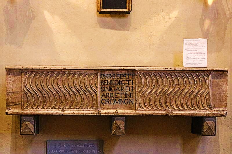 None of his writings have survived but we have two testimonies of his deep piety and devotion to the Passion of Jesus and to he Holy Virgin. In the last years of his life, he commissioned the Crucifix called “Of Beato Benedetto” which today stands on the High Altar of the Basilica of St Francis in the centre of Arezzo, where his body was also transported after the demolition of the Convent in which he died and was laid. Below is a glimpse of the right wall of the Church of San Francesco with a view of five Chapels which alternate between the classical and Gothic styles. The first of these, on the left in the classical style, is the Gozzari Chapel. Here is the Sarcophagus containing the remains of Blessed Benedetto Sinigardi.