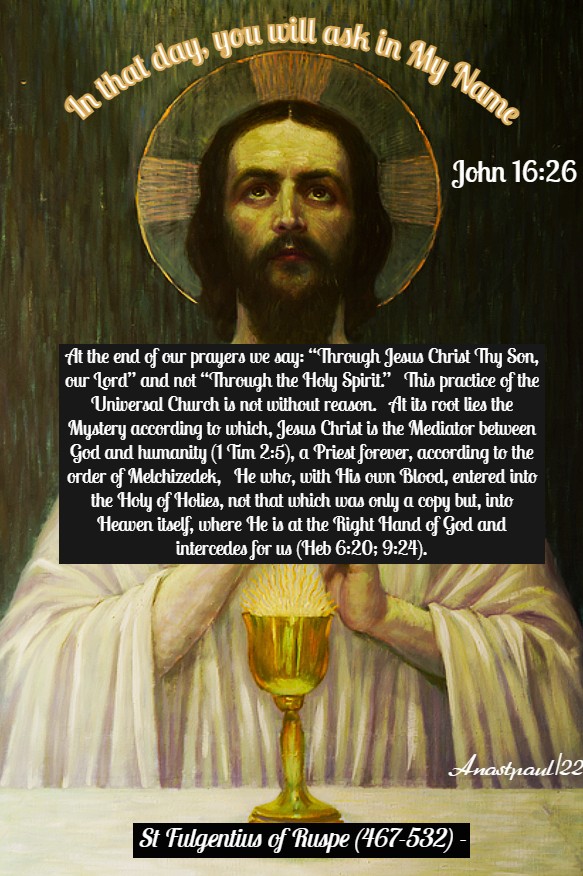 May that food allowance which God shares among us, be our nourishment. Let us draw from it the solid food of worthy behaviour, so that we may come to the reward of eternal life. For fear lest we collapse along the way, let us believe in Him, Who gives Himself to us as Food (Mt 15:32) and reserves Himself to be our Reward, that we may find joy when we reach our homeland. Let us believe and hope in Him; let us love Him above all and in all. For Christ is our Food and will be our Reward. Christ is the nourishment and comfort of travellers on their way; He is the contentment and rejoicing of the blessed in their repose.” – St Fulgentius of Ruspe (467-532) Bishop Father (Sermon 1, 2-3).
