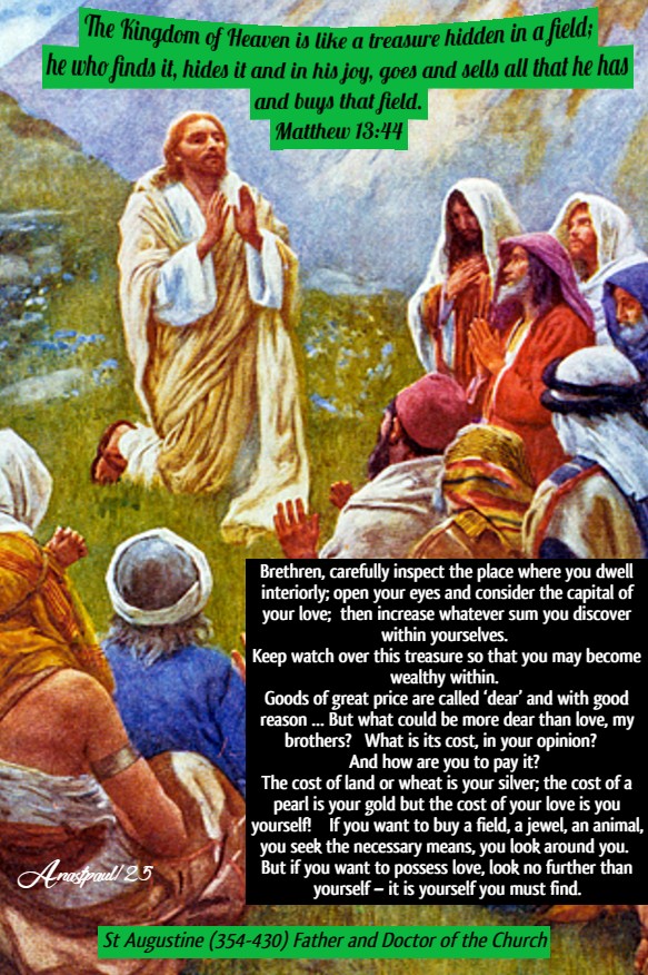 REFLECTION – “Brethren, carefully inspect the place where you dwell interiorly; open your eyes and consider the capital of your love; then increase whatever sum you discover within yourselves. Keep watch over this treasure so that you may become wealthy within. Goods of great price are called ‘dear’ and with good reason … But what could be more dear than love, my brothers? What is its cost, in your opinion? And how are you to pay it? The cost of land or wheat is your silver; the cost of a pearl is your gold but the cost of your love is you, yourself! If you want to buy a field, a jewel, an animal, you seek the necessary means, you look around you. But if you want to possess love, look no further than yourself – it is yourself you must find.