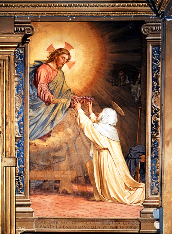 It was an awful cross for her to bear, when this very woman, whom she had so tenderly nursed, instigated by Satan, not only complained of her but slandered her in the whole City. But Christ visited her and presenting to her two crowns, one of gold, the other of thorns, said: “Which of these two do you desire?” Catherine answered: “Lord, I desire to resemble Thee in this life and it is a joy to me to suffer as Thou didst:” and with these words she took the crown of thorns and pressed it upon her head. Christ, upon this, commanded her to continue her charity towards the sick which she did with unprecedented patience and kindness.