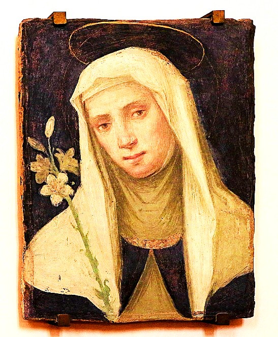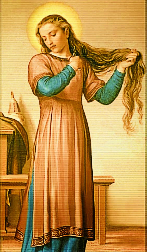 Persuaded by her sister, she once began to pay more attention to her dresses and to curl her hair after the prevailing fashion of the world. This lasted, however, only a short while, for she became aware, during her prayers, how much God was displeased with such vanities and how long her pious sister would have to suffer, on account of it in purgatory. Hencfprward, she refrained from it and repented of her folly, as long as she lived. Her parents desired her to marry but she replied: “I am already wedded to a most noble Spouse and shall never bestow my love on a human being” and cutting off her hair, she covered her head with a veil.