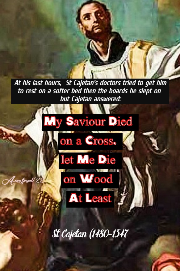 At his last hours, St Cajetan’s doctors tried to get him to rest on a softer bed then the boards he slept on but Cajetan answered: