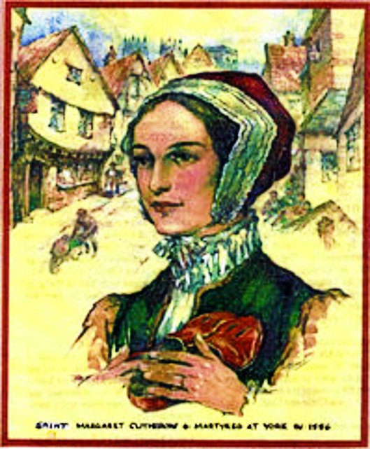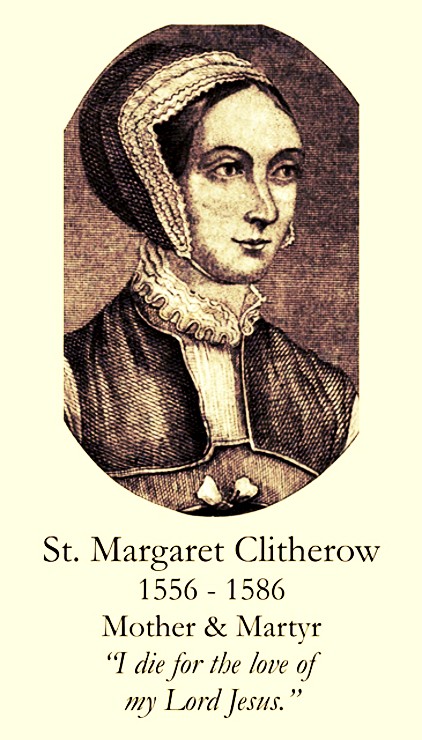Saint of the Day – 25 March – Blessed Margaret Clitherow (1556-1586) “The Pearl of York”Martyr, Married Laywoman and Mother of 3. Her 2 sons became Priests and her daughter a Nun. She was Beatified on 15 December 1929 by Pope Pius XI and Canonised with the 40 Martyrs of England and Wales. Born in 1556 at York, England as Margaret Middleton and died by being crushed to death, on Good Friday, 25 March 1586 at their home, No 10-11 The Shambles,York. Also known as – Margaret Clitheroe, Margaret Middleton, Margarita, Margherita, Marguerite. “The Pearl of York.” Patronages – the Catholic Women’s League, business-women, converts, Martyrs, Co-Patron of the English Latin Mass Society which organises an annual pilgrimage to her Shrine in York . Additional Memorial – 4 May with the 40 Martyrs.