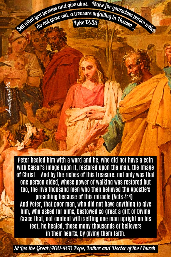 Hence, the blessed Apostle Peter, when he was going up to the temple and was asked for alms by a lame man, said, “I have neither silver nor gold but what I do have I give you; in the Name of Jesus Christ the Nazorean, rise and walk” (Acts 3:6)… Peter healed him with a word and he, who did not have a coin with Cæsar’s image upon it, restored upon the man, the Image of Christ. And by the riches of this treasure, not only was that one person aided, whose power of walking was restored but too, the five thousand men who then believed the Apostle’s preaching because of this miracle (Acts 4:4). And Peter, that poor man, who did not have anything to give him, who asked for alms, bestowed so great a gift of Divine Grace that, not content with setting one man upright on his feet, he healed, those many thousands of believers in their hearts, by giving them faith.” – St Leo the Great (400-461) Pope, Father and Doctor of the Church (Sermon 95 2-3).