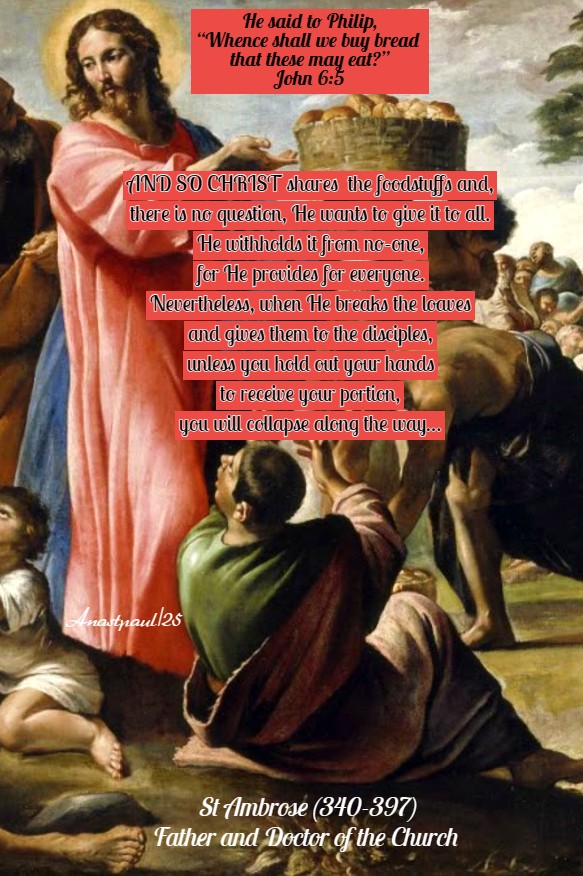 “AND SO CHRIST shares the foodstuffs and, there is no question, He wants to give it to all. He withholds it from no-one, for He provides for everyone. Nevertheless, when He breaks the loaves and gives them to the disciples, unless you hold out your hands to receive your portion, you will collapse along the way…”