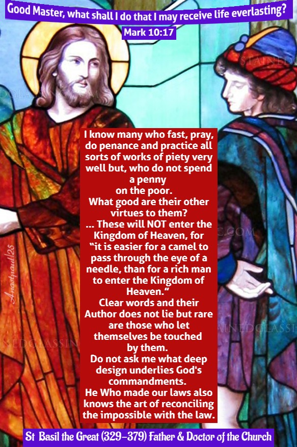 These will not enter the Kingdom of Heaven, for “it is easier for a camel to pass through the eye of a needle, than for a rich man to enter the Kingdom of Heaven.” Clear words and their Author does not lie but rare are those who let themselves be touched by them. “How will we live when we are stripped of everything?” is what they exclaim. “What sort of life will we lead when everything has been sold and there is no longer any property?” Do not ask me what deep design underlies God’s commandments. He Who made our laws also knows the art of reconciling the impossible with the law.” – St Basil the Great (329-379) Bishop of Caesarea in Cappadocia, Father & Doctor of the Church (Sermon 7 on Wealth).