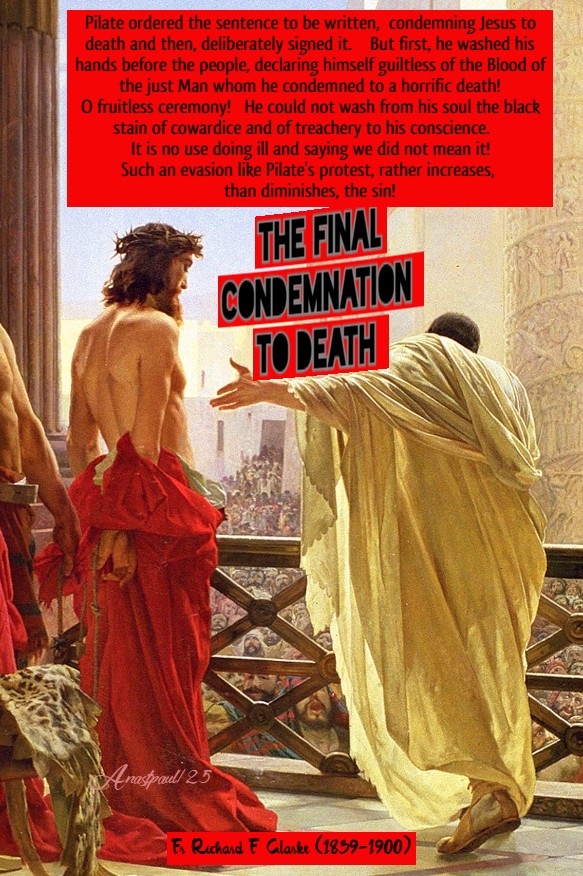 +3. Pilate ordered the sentence to be written, condemning Jesus to death and then, deliberately signed it. But first, he washed his hands before the people, declaring himself guiltless of the Blood of the just Man whom he condemned to a horrific death!
