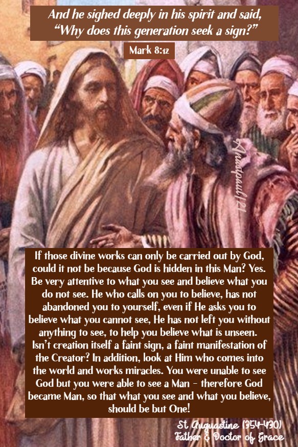 This miracle was presented to our senses, in order to stimulate our minds… and so make us marvel at “the God we do not see because of his works, which we do see” (Rom 1,20). For then, when we have been raised to the level of faith and purified by faith, we shall long to behold, although not with our eyes, the invisible God Whom we recognise, through what is visible. This miracle was performed for the multitude to see; it was recorded for us to hear. Faith does for us, what sight did for them. We behold with the mind, what our eyes cannot see and we are preferred to them because of us it was said: “Blessed are those who have not seen and yet believe” (Jn 20,29).” – St Augustine (354-430) Father and Doctor of the Church (Homilies on Saint John’s gospel, 24).