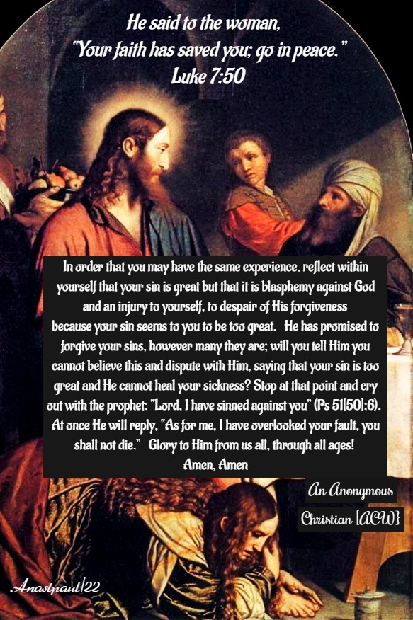 In order that you may have the same experience, reflect within yourself that your sin is great but that it is blasphemy against God and an injury to yourself, to despair of His forgiveness because your sin seems to you to be too great. He has promised to forgive your sins, however many they are; will you tell Him you cannot believe this and dispute with Him, saying that your sin is too great and He cannot heal your sickness? Stop at that point and cry out with the prophet: “Lord, I have sinned against you” (Ps 50:6). At once He will reply, “As for Me, I have overlooked your fault, you shall not die.” Glory to Him from us all, through all ages! Amen, Amen.” ~ An Anonymous Christian Syrian Writer of the 6th Century [ ACW} (From a collection of Sermons on the sinful woman, 1, 4.5.19.26.28).