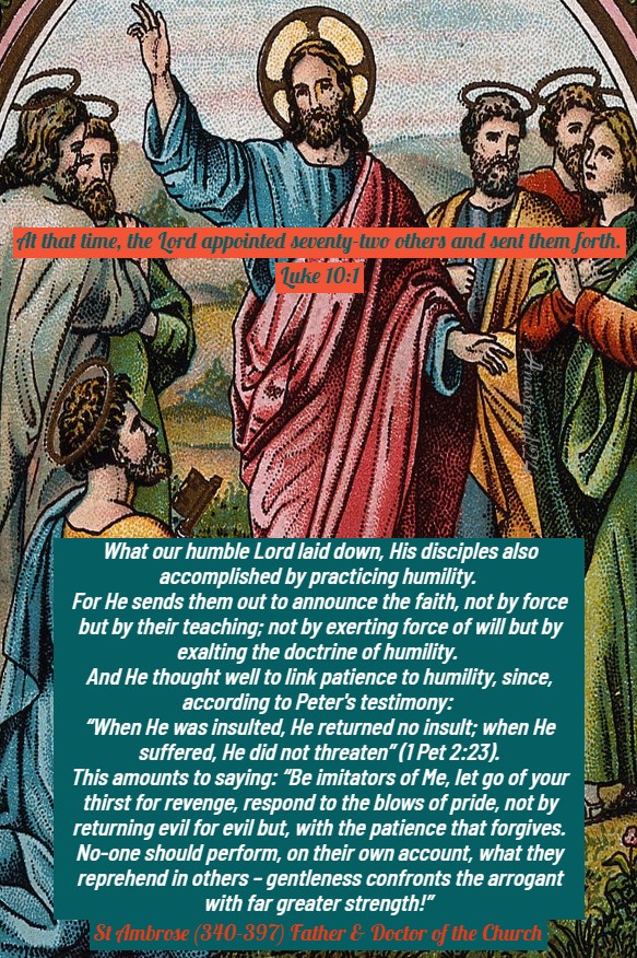 What our humble Lord laid down, His disciples also accomplished by practicing humility. For He sends them out to announce the faith, not by force but by their teaching; not by exerting force of will but by exalting the doctrine of humility. And He thought well to link patience to humility, since, according to Peter’s testimony: “When He was insulted, He returned no insult; when He suffered, He did not threaten” (1 Pet 2:23).