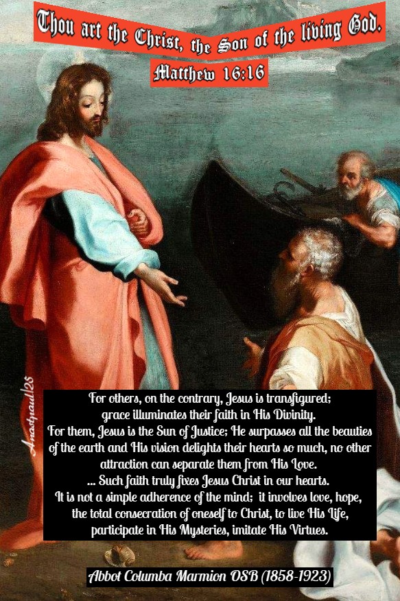 Such faith truly fixes Jesus Christ in our hearts. It is not a simple adherence of the mind; it involves love, hope, the total consecration of oneself to Christ, to live His Life, participate in His Mysteries, imitate His Virtues.” – Abbot Columba Marmion OSB (1858-1923) a Benedictine Irish Monk and the 3rd Abbot of Maredsous Abbey in Belgium. He was one of the most popular and influential Catholic Authors of the 20th Century. His books are considered spiritual classics. (This excerpt from a compilation ‘To Live by Faith, Christ the Ideal of the Priest’).