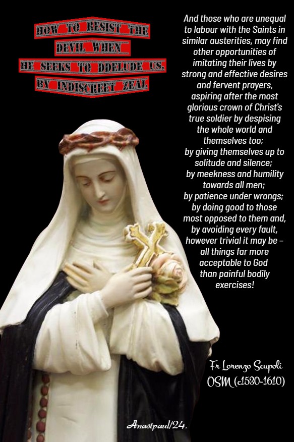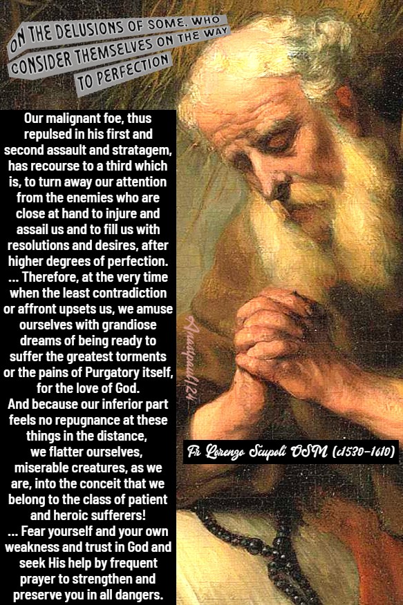 “When our cunning adversary perceives that we are walking onward in the path of holiness with fervent, yet well-regulated desires, being unable to draw us aside by open allurements, he transforms himself into an Angel of Light and, by suggestions of seeming friendship, words from Scripture and examples of Saints, importunately urges us to aspire indiscreetly, to the height of perfection that ,so doing, he may cause us to fall headlong from thence.