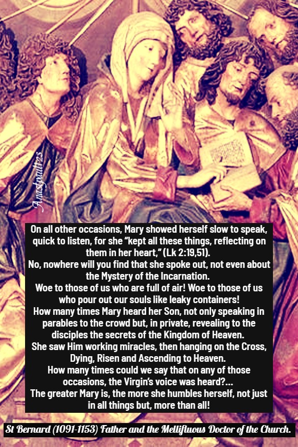 For what recommends the discipline of silence with such weight and such authority, what checks the evil of restless tongues and the storms of words, as the Word of God, Silent in the midst of men. “There is no word on My tongue” (Ps 138:4), the Almighty Word seems to confess while He is subject to His Mother. What madness then will prompt us to say: “With our tongues we can do great things; our lips are good friends to us; we own no master” (Ps 11:5). If I were allowed, I would gladly be dumb and be brought low and be silent, even of good things that I might be able, the more attentively and diligently, to apply my ear to the secret utterances and sacred meaning of this Divine Silence, learning in silence, in the school of the Word, if only for as long as the Word Himself was Silent under the instruction of His Mother …