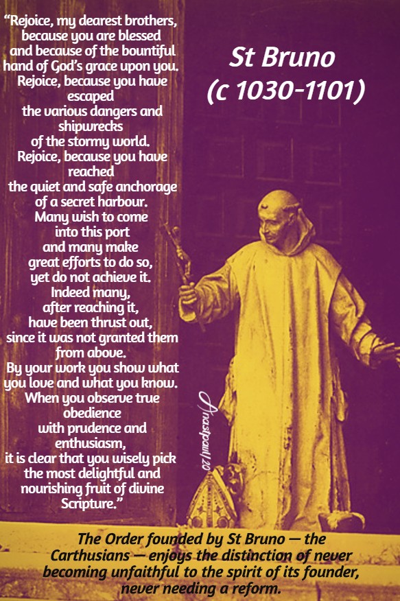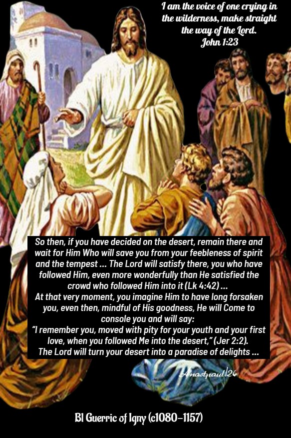 So then, if you have decided on the desert, remain there and wait for Him Who will save you from your feebleness of spirit and the tempest … The Lord will satisfy there, you who have followed Him, even more wonderfully than He satisfied the crowd who followed Him into it (Lk 4:42) … At that very moment, you imagine Him to have long forsaken you, even then, mindful of His goodness, He will Come to console you and will say: “I remember you, moved with pity for your youth and your first love, when you followed Me into the desert,” (Jer 2:2). The Lord will turn your desert into a paradise of delights, while you will proclaim (like the Prophet) that the glory of Lebanon has been given to Him, the beauty of Carmel and Sharon (Is 35:2) … Then, from the fullness of your heart, your hymn of praise will rise: “Let them give thanks to the Lord, for His wondrous deeds to the children of men! He has satisfied the longing soul and filled the hungry with good things,” (Ps 106:8).” – Bl Guerric of Igny (c1080-1157) Cistercian Abbot (4th Sermon for Advent).