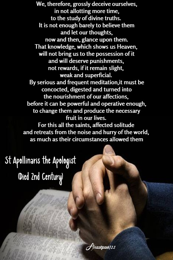 So then, if you have decided on the desert, remain there and wait for Him Who will save you from your feebleness of spirit and the tempest … The Lord will satisfy there, you who have followed Him, even more wonderfully than He satisfied the crowd who followed Him into it (Lk 4:42) … At that very moment, you imagine Him to have long forsaken you, even then, mindful of His goodness, He will Come to console you and will say: “I remember you, moved with pity for your youth and your first love, when you followed Me into the desert,” (Jer 2:2). The Lord will turn your desert into a paradise of delights, while you will proclaim (like the Prophet) that the glory of Lebanon has been given to Him, the beauty of Carmel and Sharon (Is 35:2) … Then, from the fullness of your heart, your hymn of praise will rise: “Let them give thanks to the Lord, for His wondrous deeds to the children of men! He has satisfied the longing soul and filled the hungry with good things,” (Ps 106:8).” – Bl Guerric of Igny (c1080-1157) Cistercian Abbot (4th Sermon for Advent).