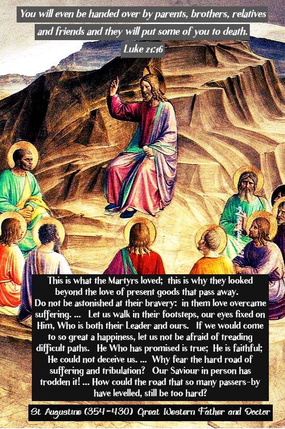 This is what the Martyrs loved; this is why they looked beyond the love of present goods that pass away. Do not be astonished at their bravery: in them love overcame suffering. … Let us walk in their footsteps, our eyes fixed on Him, Who is both their Leader and ours. If we would come to so great a happiness, let us not be afraid of treading difficult paths. He Who has promised is true; He is faithful; He could not deceive us. …Why fear the hard road of suffering and tribulation?Our Saviour in person has trodden it!