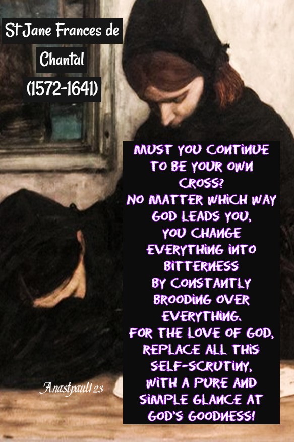 “Must you continue to be your own cross? No matter which way God leads you, you change everything into bitterness by constantly brooding over everything. For the love of God, replace all this self-scrutiny, with a pure and simple glance at God’s goodness!”