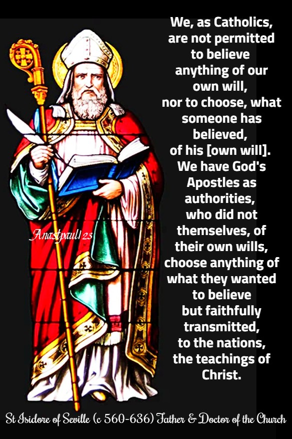 “We, as Catholics, are not permitted to believe anything of our own will, nor to choose, what someone has believed, of his [own will]. We have God’s Apostles as authorities, who did not themselves, of their own wills, choose anything of what they wanted to believe but faithfully transmitted, to the nations, the teachings of Christ.”