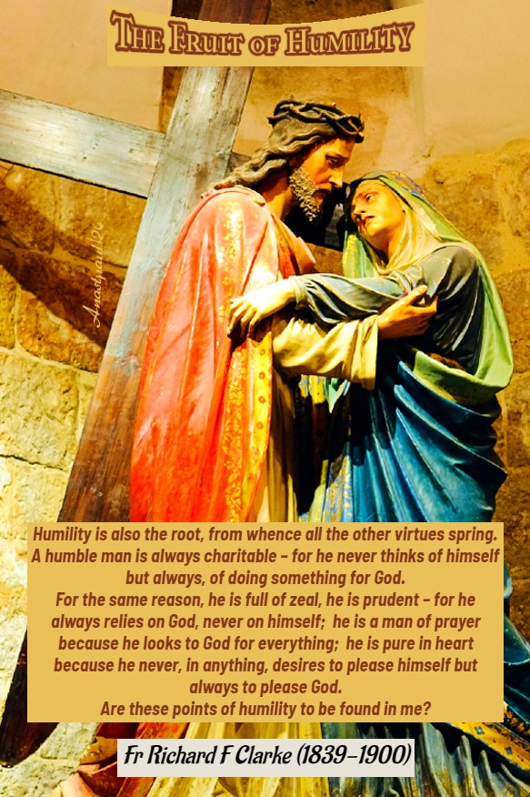 Humility is also the root, from whence all the other virtues spring. A humble man is always charitable – for he never thinks of himself but always, of doing something for God. For the same reason, he is full of zeal, he is prudent – for he always relies on God, never on himself; he is a man of prayer because he looks to God for everything; he is pure in heart because he never, in anything, desires to please himself but always to please God. Are these points of humility to be found in me?