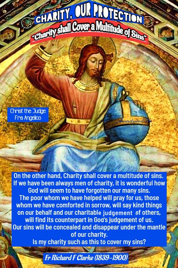 On the other hand, Charity shall cover a multitude of sins. If we have been always men of charity, it is wonderful how God will seem to have forgotten our many sins. The poor whom we have helped will pray for us, those whom we have comforted in sorrow, will say kind things on our behalf and our charitable judgeement of others, will find its counterpart in God’s judgement of us. Our sins will be concealed and disappear under the mantle of our charity. Is my charity such as this to cover my sins?