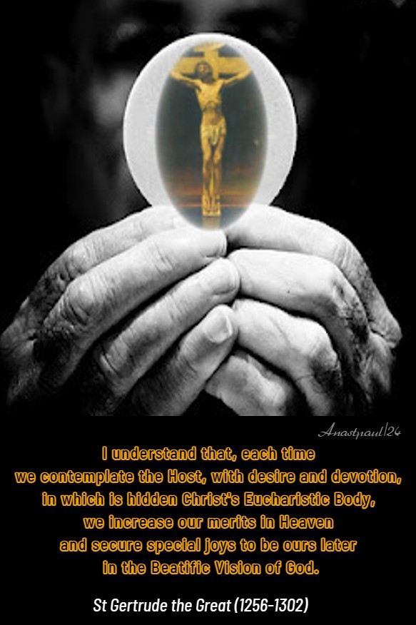 “I understand that, each time we contemplate the Host, with desire and devotion, in which is hidden Christ’s Eucharistic Body, we increase our merits in Heaven and secure special joys to be ours later in the Beatific Vision of God.”