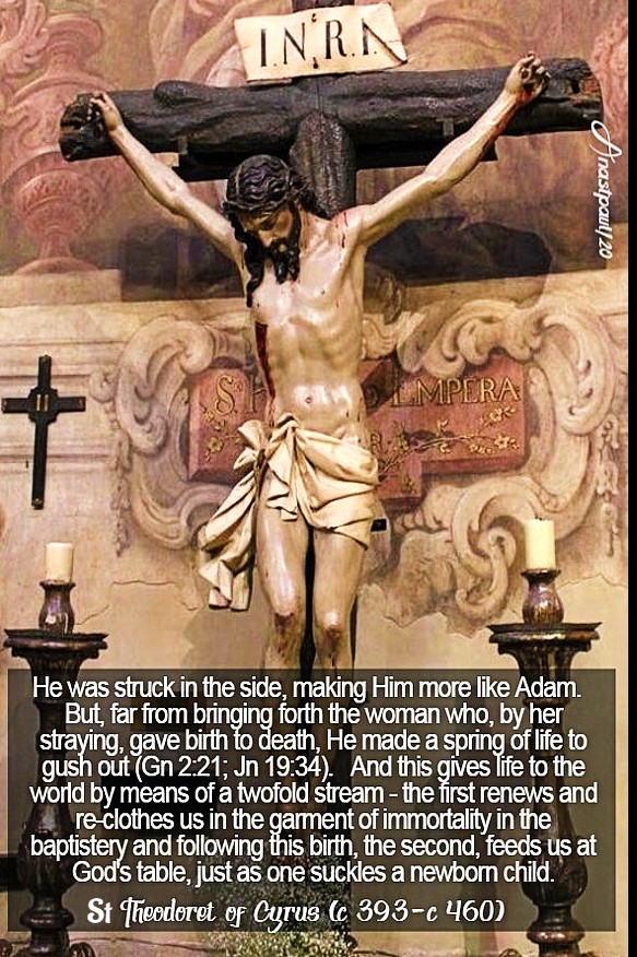 He was struck in the side, making Him more like Adam. But, far from bringing forth the woman, who, by her straying, gave birth to death, He made a spring of life to gush out (Gn 2:21; Jn 19:34). And this gives life to the world by means of a twofold stream – the first renews and re-clothes us in the garment of immortality in the baptistery and following this birth, the second, feeds us at God’s Table, just as one suckles a newborn child.” … St Theodoret of Cyrus (c 393-c 460) Bishop (Treatise on the Incarnation, 26-27).