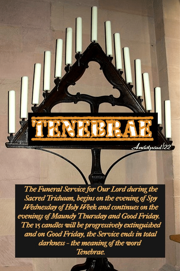The Office of Tenebrae The public singing of part of the Divine Office, on Wednesday, Thursday and Friday evenings in Holy Week, anticipating Matins and Lauds of Holy Thursday, Good Friday and Holy Saturday. This custom goes back centuries and acquired the name because of the mourning ritual surrounding the ceremony which includes a triangular candlabra bearing fifteen candles. These are extinguishedt one by one until, after the last candle is extinguished, a prayer is said in darkness, one candle is lit and the assembly dispersed in silence.
