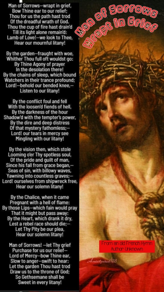 Man of Sorrows—wrapt in grief, Bow Thine ear to our relief; Thou for us the path hast trod Of the dreadful wrath of God. Thou the cup of fire hast drain’d Till its light alone remain’d: Lamb of Love!—we look to Thee, Hear our mournful litany!