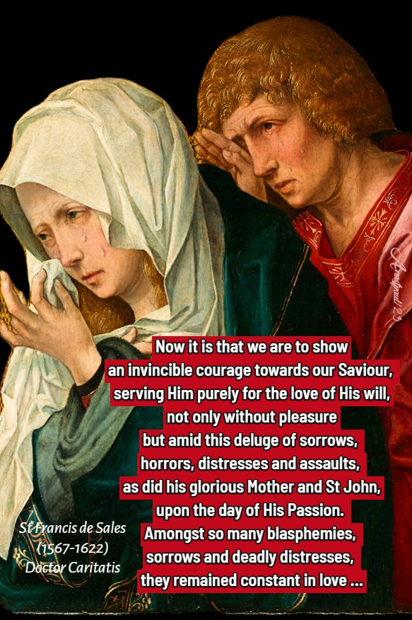 “Now it is that we are to show an invincible courage towards our Saviour, serving Him purely for the love of His Will, not only without pleasure but amid this deluge of sorrows, horrors, distresses and assaults, as did his glorious Mother and St John, upon the day of His Passion. Amongst so many blasphemies, sorrows and deadly distresses, they remained constant in love …”