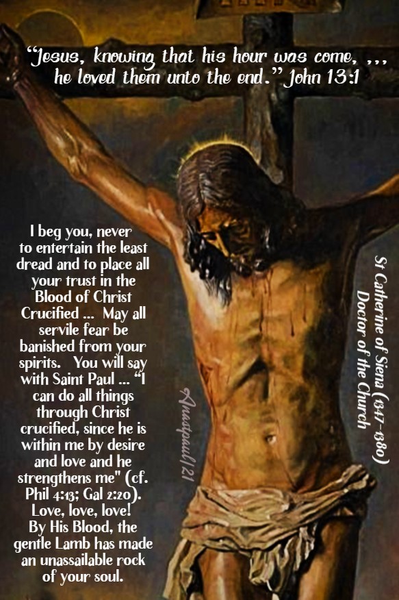 That is why, my beloved, I beg you never to entertain the least dread and to place all your trust in the Blood of Christ Crucified … May all servile fear be banished from your spirits. You will say with Saint Paul …: “I can do all things through Christ crucified, since he is within me by desire and love and he strengthens me” (cf. Phil 4:13; Gal 2:20). Love, love, love! By His Blood, the gentle Lamb has made an unassailable rock of your soul.” – St Catherine of Siena (1347-1380) Dominican tertiary, Doctor of the Church, Co-patron of Europe – Letter 129